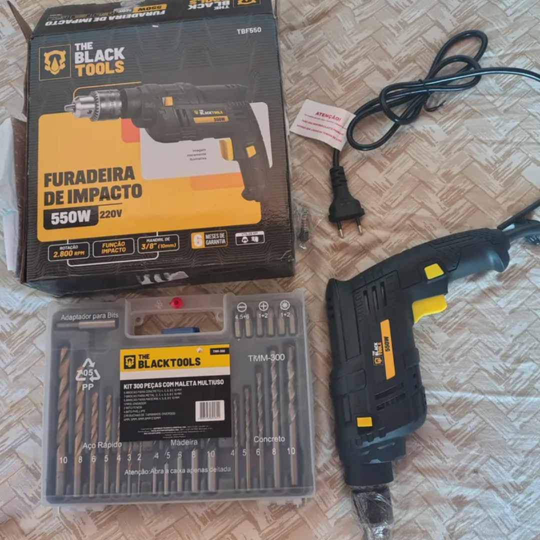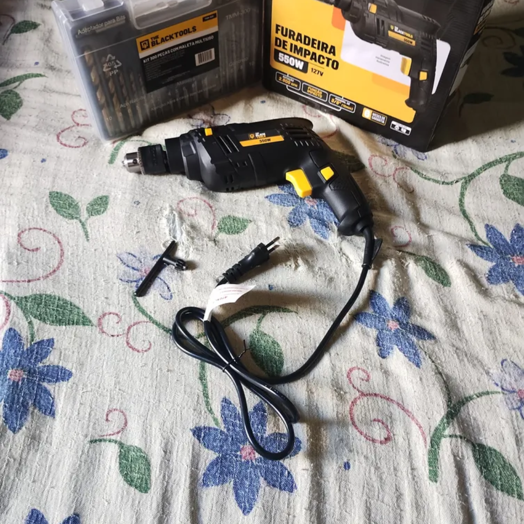 A Furadeira de Impacto 550W com Kit 300 Peças é a solução completa para quem busca praticidade e eficiência em reparos, montagens e perfurações. Potente e versátil, ela fura madeira, metal e alvenaria com facilidade, enquanto o kit com 300 acessórios garante que você tenha sempre a ferramenta certa para cada tarefa.